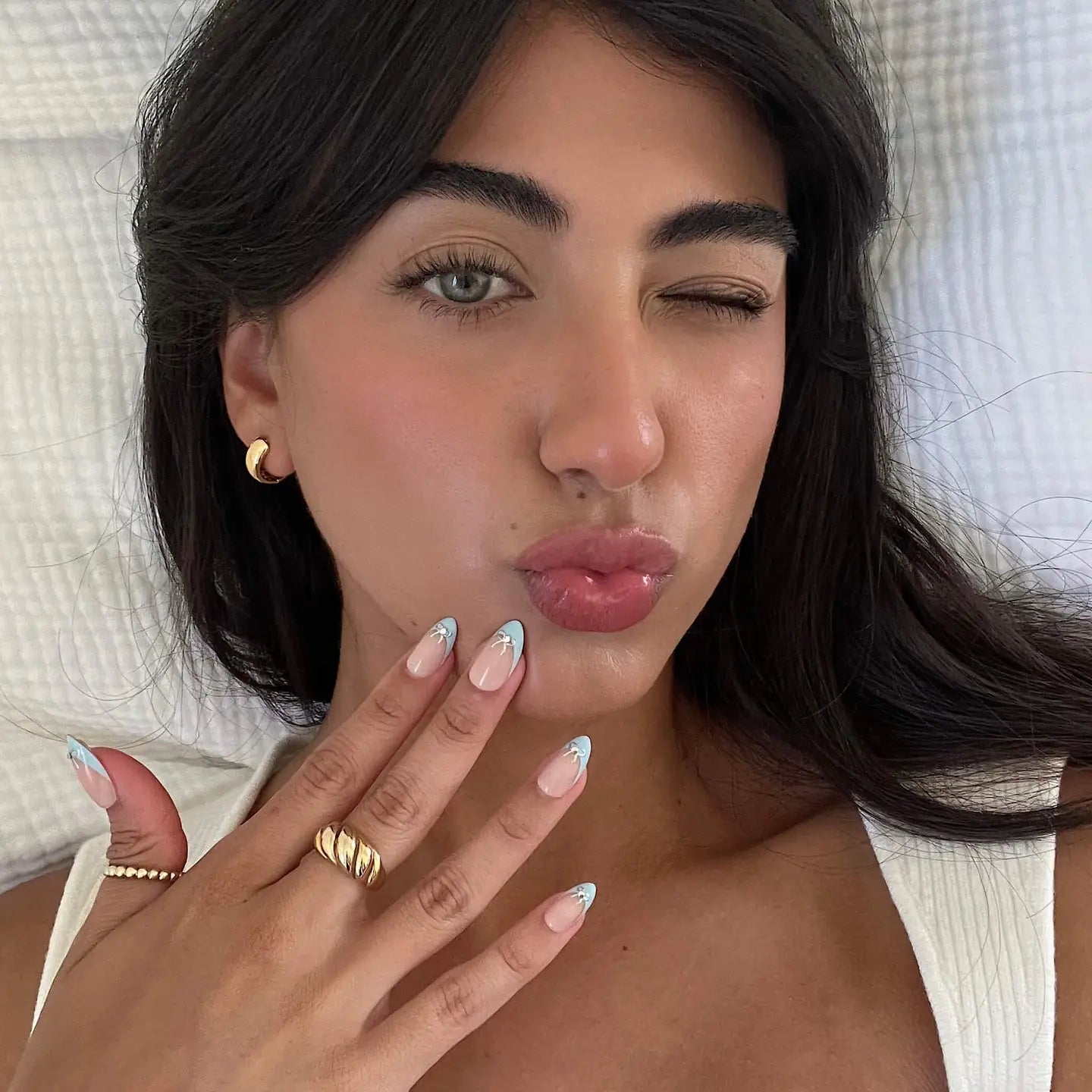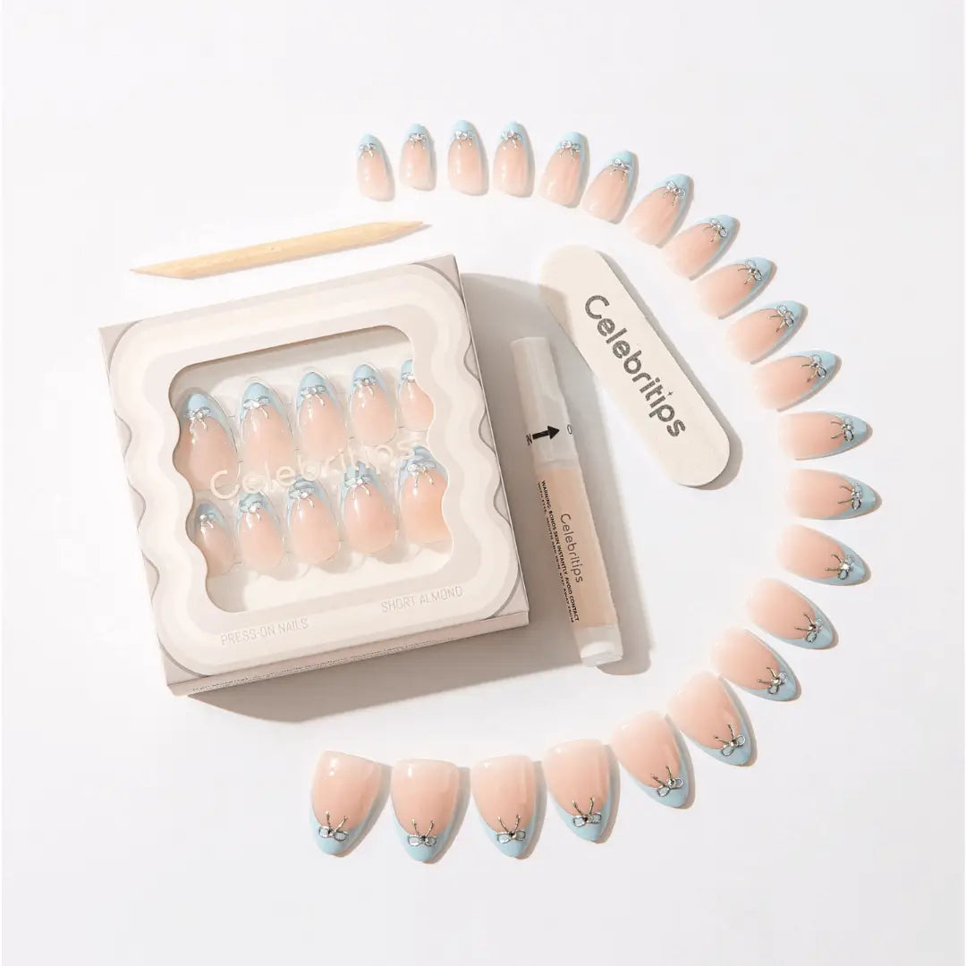 Say hello to Baby Blue Ribbon 🩵 — the perfect dreamy blue carefully crafted to flatter every skin tone. These short almond nails feature delicate pastel tips adorned with 3D silver bows and shimmering rhinestones, giving them a look as sweet and charming as frosting on a cake 🎀✨.Â